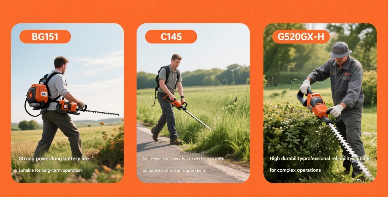 چمن زنی با مساحت بزرگ: برای چمن زنی مناطق بزرگ و زمین های پیچیده، توصیه می شود یک ماشین چمن زنی کوله پشتی مانند برس برش کوله پشتی قدرتمند BG151 و برس برش کوله پشتی BG350A-GX 4 Stroke انتخاب کنید. این مدلها قدرتمند هستند و عمر باتری طولانی دارند، برای عملیات طولانیمدت مناسب هستند و میتوانند کارهای چمنزنی در سطح وسیع را به طور موثر انجام دهند.
